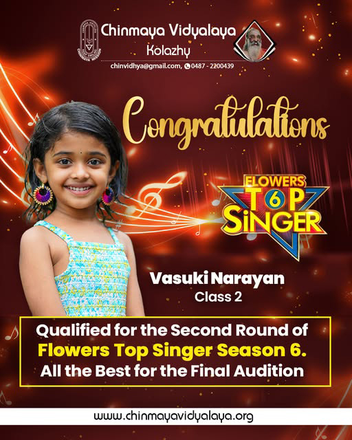 Congratulations to Vasuki Narayan (Class 2) for qualifying for the Second Round of Flowers Star Singer Season 6!