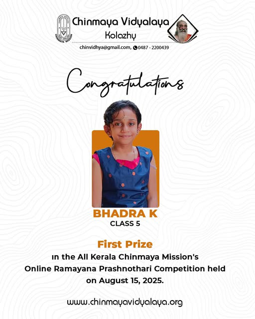 First Prize in the All Chinmaya Mission's Online Ramayana Prashnothari Competition held on August 15, 2025.