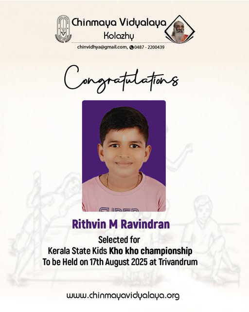 Congratulations to Rithvin M Ravindran on being selected for the Kerala State Kids Kho Kho Championship!. We are proud of your hard work and dedication. Wishing you all the very best for the championship to be held on 17th August 2025 at Trivandrum. Keep shining and make us proud!